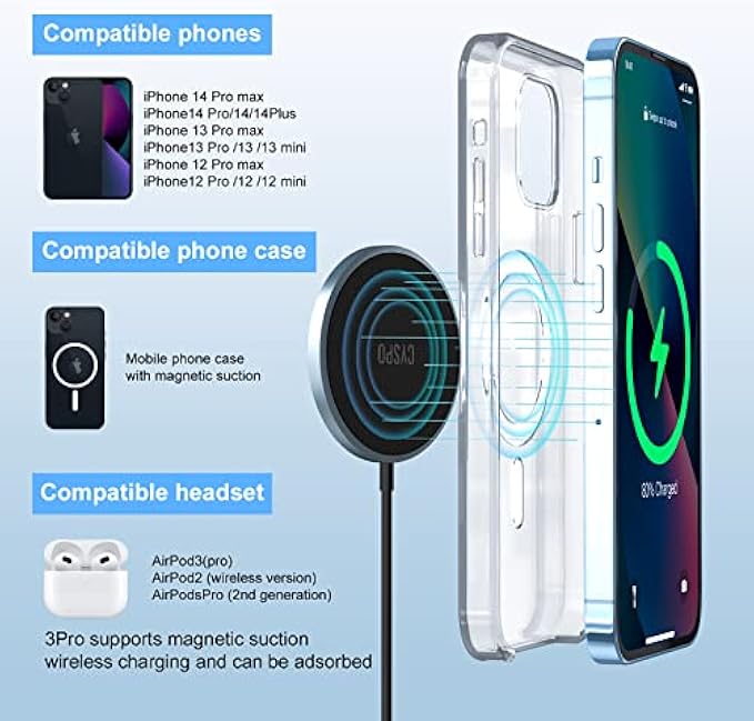 • 【Specifically for iPhone 14/13/12 Series】The magnetic charging feature makes the mag safe charger perfectly aligned with your phone and firmly attached. Up to 15W secure mag. safe wireless charging pads are perfectly compatible with iPhone 14, iPhone 14 Pro, iPhone 14 Plus, iPhone 14 Pro Max, iPhone 13, 13 Pro, 13 Pro Max, 13 mini, iPhone 12, 12 Pro, 12 Pro Max, 12 mini. (Note: Regular cases are not supported, as they can weaken the magnetic adsorption.) And with models of AirPods Pro /3 & 2 with a wireless charging case. The iPhone 8 through iPhone 11 models lack built-in magnetic functionality and require a mag safe phone case to enable magnetic adsorption.