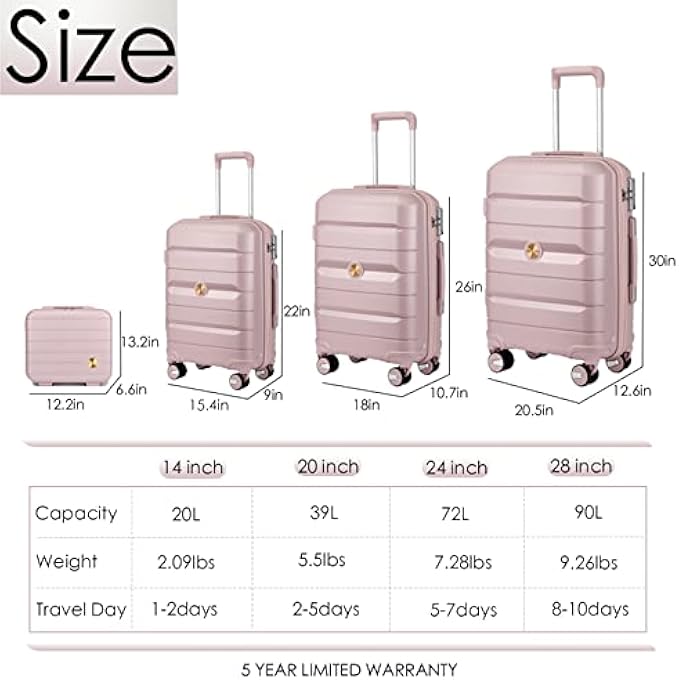 Dimensions: [ 14": 12.2"L×6.6"W×13.2"H; 20": 15.4"L×9.0"W×22.0"H (includes wheels) ]; [ 24": 18.0"L×10.7"W×26.0"H (includes wheels) ]; [ 28": 20.5"L×12.6"W×29.9"H (includes wheels) ]. 20-inch carry-on luggage is airline-approved. 3 pieces set with cosmetic case also come with luggage tap.And these luggage sets come with a 5-year limited warranty, providing long-lasting protection for your investment.