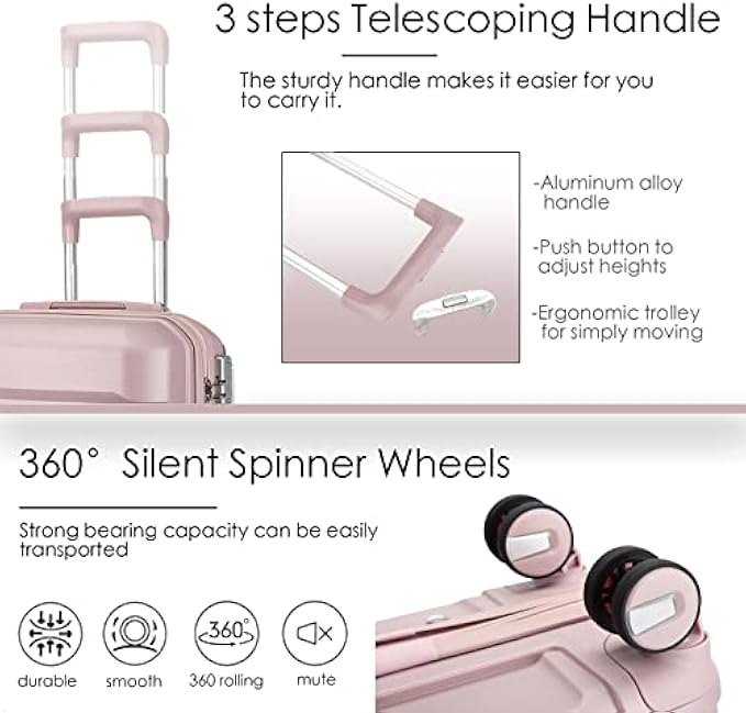 Wheels And Handles: 4 double 360° mute spinner wheels provide smooth movement in all directions, whether on cobblestones or pavement. The top and side grab handles are sturdy, elastic, not easy to break, and easy to carry. Push-button locking handle adjusts to different stages, offering comfortable maneuvering to accommodate travelers of any height.