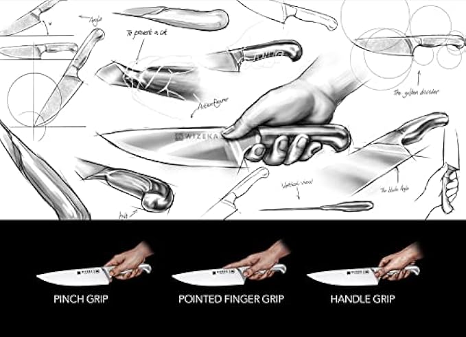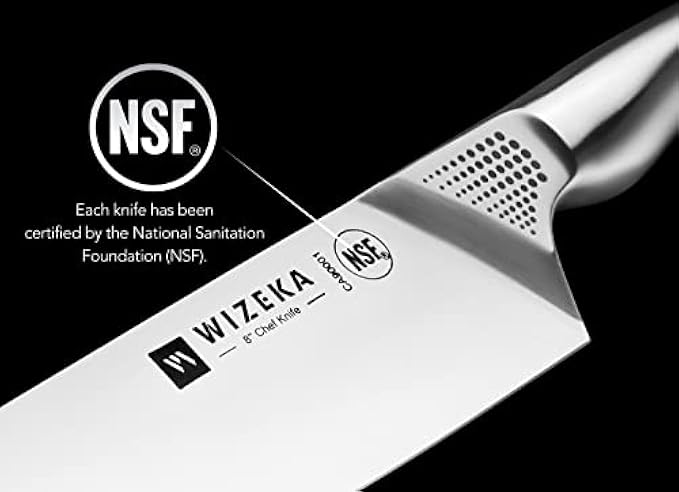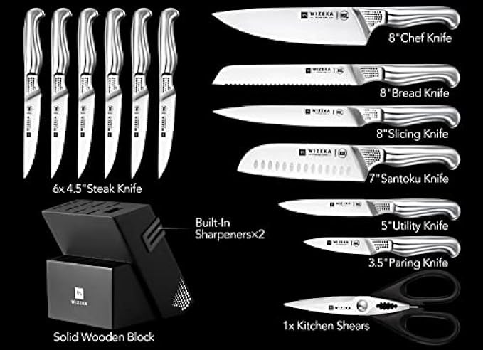 • [Thanksgiving & Christmas Gifts] WIZEKA kitchen knife sets with block including: 8" chef's knife, 8" bread knife, 8" slicing knife, 7" santoku knife, 5" utility knife, 3.5" paring knife, 6 pcs 4.5" serrated steak knife, 1 kitchen shears and wood knife block with two built-in sharpener. Perfect for the home cook or professional!Best Holiday Gifts Like Father's Day Gifts