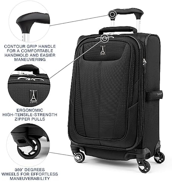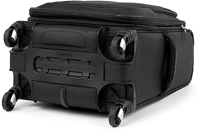 This carry-on luggage has 4 wheel spinners that rotate 360 degree for a smooth roll. Lightweight, sturdy PowerScope handle stops at 38 inch and 42.5 inch features a patented contour grip with rubberized touch points for easy maneuvering. Unique bottom tray design increases durability for this soft sided luggage