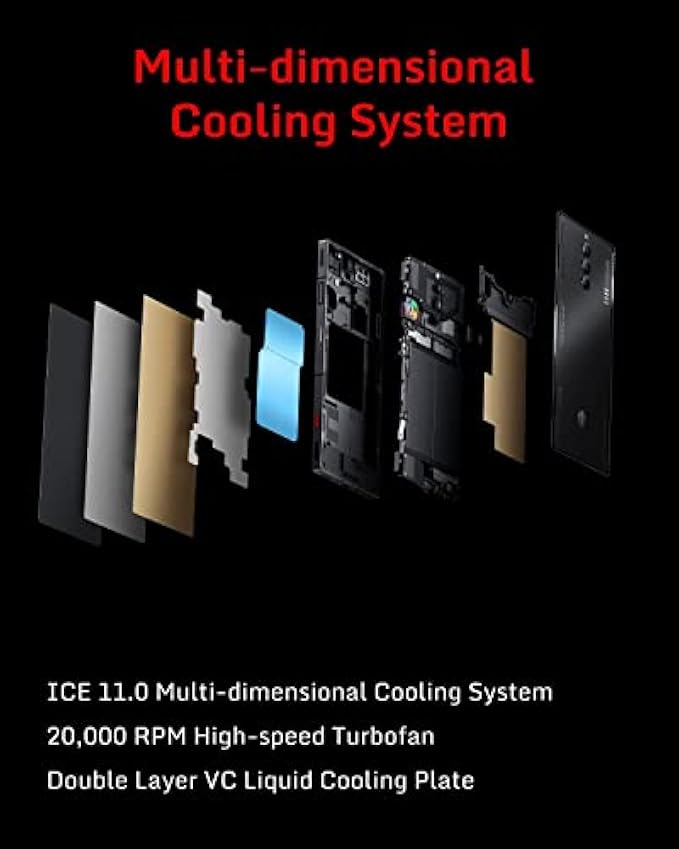 【Multi-Dimensional Cooling System】The Gaming Phone incorporates new aerospace-grade phase change materials (PCM) . Heat can be stored inside this material and released slowly so you feel less heat from the phone while playing, making it more comfortable to hold the phone. The High-Speed Built-In Turbofan accelerates heat dissipation and the fan noise is as quiet as a whisper.