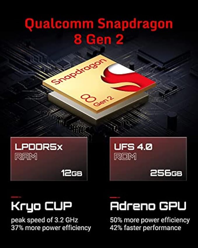 【Latest Chip and Larger Storage】The Gaming Smartphone has the latest Qualcomm Snapdragon 8 Gen 2 (UFS 4.0 + LPDDR5X). Play your favorite games with ease with the raw power of the new CPU clocking in at nearly 3.2GHz and enjoy Triple-A graphics thanks to the fast rendering power of the GPU. 12GB RAM + 256GB ROM provides not only a fun gaming experience and effects, also large storage space for game downloads.