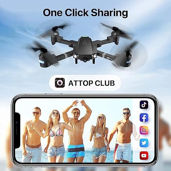• [1080P 120° FPV Drone & APP Control] The sky quad drone equipped with 120° wide-angle 1080P photography, which provides a wider breathtaking field of view and lets you enjoy HD pictures and videos from the perspective of the 1080p fpv drones via the “ATTOP CLUB” APP. By connecting your phone/iPad with the long distance drones with camera, you can enjoy a real-time panoramic view of the landscape 196-292 feet away, review them from the folder, and share them on your social media with ease.