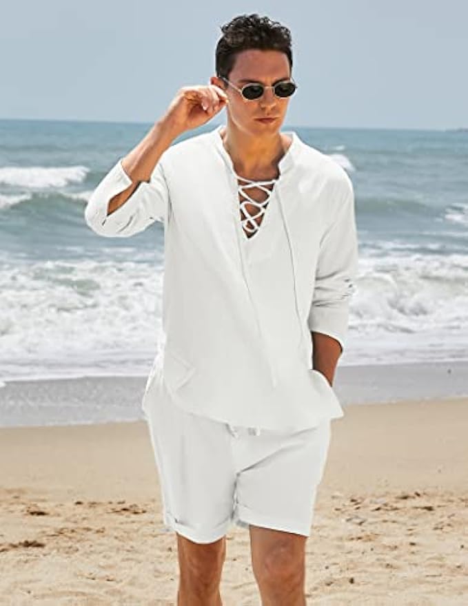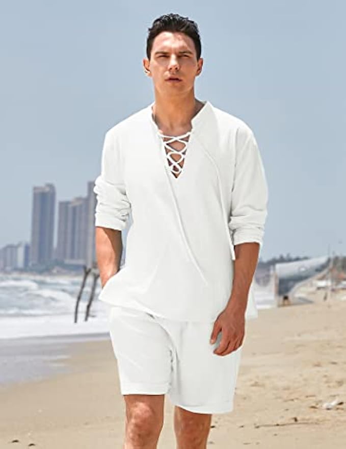 COOFANDY Men 2 Pieces Cotton Linen Set Beach Outfit Summer Hippie Shirt And Short Set Renaissance Lace Up Henley Suit