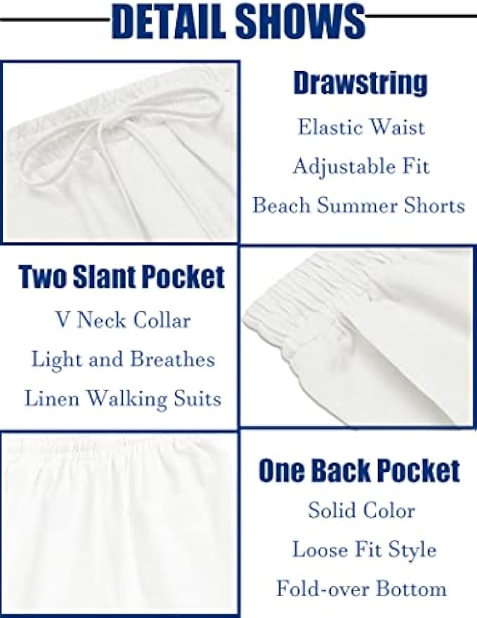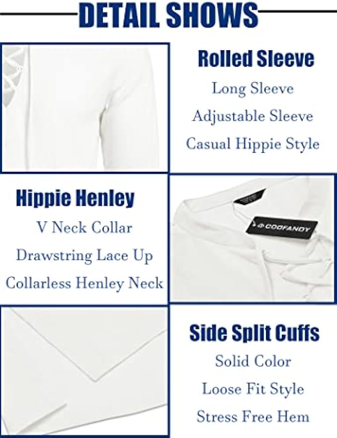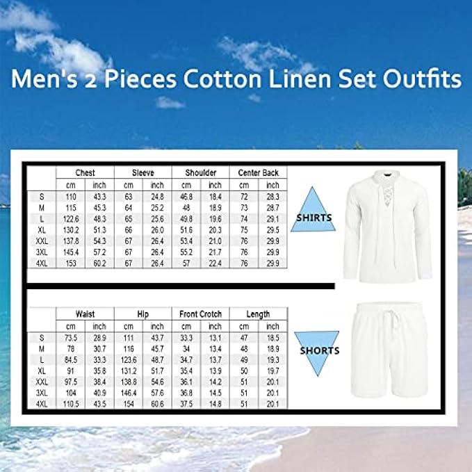 <li class="a-spacing-mini"><span class="a-list-item"> 100% Cotton </span></li> <li class="a-spacing-mini"><span class="a-list-item"> Adjustable,Drawstring,Lace Up closure </span></li> <li class="a-spacing-mini"><span class="a-list-item"> Machine Wash </span></li> <li class="a-spacing-mini"><span class="a-list-item"> 【Soft Cotton Material】The men 2 piece cotton set outfits is made of soft, lightweight and breathable cotton material, there are relatively small retro texture patterns on the fabric, more retro. Men beach outfits sets keep you cool and relaxed all the time. </span></li> <li class="a-spacing-mini"><span class="a-list-item"> 【Mens Two Piece Outfits Sets】Mens matching linen shirt and short set is consists of summer hippie shirt and casual shorts. Men's 2 piece linen outfits is perfect for spring, summer and fall season. The short vacation outfits is aslo a pretty choice to join a beach wedding party. </span></li> <li class="a-spacing-mini"><span class="a-list-item"> 【Lace Up Hippie Shirts】This lace up hippie henley shirts feature with solid color, v neck, drawstring lace up, cross strap, adjustable sleeves(long sleeves &amp; rolled sleeve), jacobite kilt shirt , regular fit. renaissance costume shirts side split cuffs and hem design to make you fell stress-free. </span></li> <li class="a-spacing-mini"><span class="a-list-item"> 【Beach Summer Shorts】The mens beach short shorts design in loose fit, solid color, two slant pockets, one back pocket, fold-over design at the bottom and elastic waist with drawstring for adjustable fit. Combine with the pirate medieval shirt to creat a retro, hippie and leisure style </span></li> <li class="a-spacing-mini"><span class="a-list-item"> 【Garment Care】Machine washable. These linen suit set is perfect for daily, casual, home, beach, wedding, holiday, travel, yoga, meditation or any other casual occasions. Men's renaissance costume set is a perfect birthday, Halloween, Christmas and anniversary gifts to your husband, dad, son or friends. </span></li>