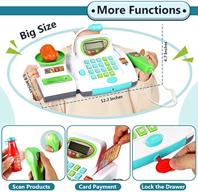 【Large Toy Cash Register】: 31*15*12cm. 3 x AA Batteries Required (Not Included).