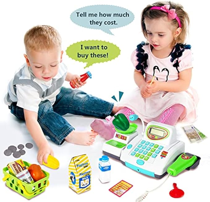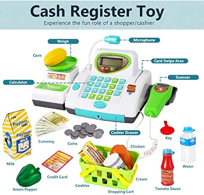 HERSITY Kids Toy Cash Register with Scanner and Microphone, Pretend Play Money Electronic Calculator Realistic Children's Supermarket Cashier Gifts for 3 4 5 Years Old Toddlers Boys Girls