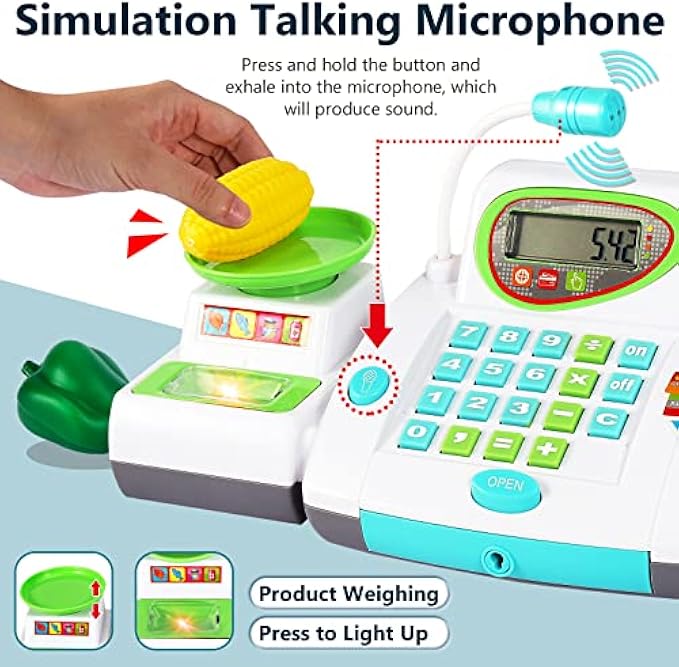 【Play Cash Register with Working Microphone】: Keep press the microphone button and exhale into the microphone, the microphone will emit sound.