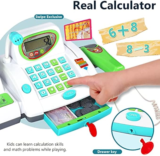【Realistic Drawer】: press the ""OPEN"" button, the drawer will pop out and make a click sound, your little salesman can also use the key to lock the drawer.