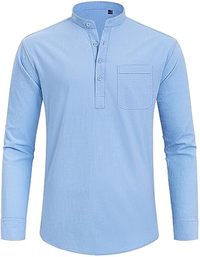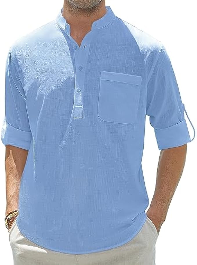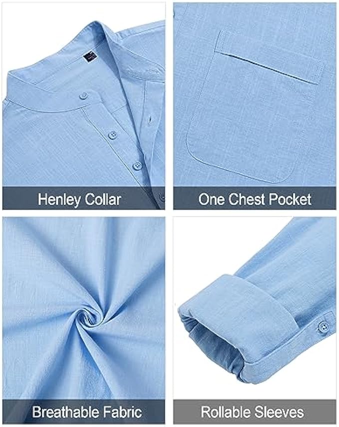 <li class="a-spacing-mini"><span class="a-list-item"> 70%cotton+30linen </span></li> <li class="a-spacing-mini"><span class="a-list-item"> Imported </span></li> <li class="a-spacing-mini"><span class="a-list-item"> Button closure </span></li> <li class="a-spacing-mini"><span class="a-list-item"> Machine Wash </span></li> <li class="a-spacing-mini"><span class="a-list-item"> 【Shrink Free】The cotton linen shirts is made of high-quality cotton and linen fabric with anti-shrink treatment, soft and comfortable,easy to iron, lightweight and cool,good breathability, take away the stuffiness, and give you a better wearing experience. </span></li> <li class="a-spacing-mini"><span class="a-list-item"> 【Unique Design】1. Long sleeve with rolled up design 2. One chest pocket makes it easy to store small items. 3. Classic Henry neck design. 4. Extra button--Cotton linen henley shirts are sewn with an eighth button, which you can use if needed </span></li> <li class="a-spacing-mini"><span class="a-list-item"> 【Easy to Match】We offer you a wide range of sizes and colors to meet your different needs. Men's cotton linen shirt sizes are standard US sizes, easy to match with various bottoms.Please refer to the size chart image to choose the size that suits you. </span></li><li class="a-spacing-mini"><span class="a-list-item">【Applicable Occasions】Mens casual cotton linen shirts are perfect for summer, vacation, beach, hippie, party, tropical, wedding, date and other daily wear. In everyday casual dressing, this men's henley shirt will always show off your charm. It is also an ideal gift for husbands, fathers, sons and friends.</span></li> <li class="a-spacing-mini"><span class="a-list-item">【Service and After-sales】If you have any questions about this men's long sleeve linen shirt, please contact us and we will solve your problem at the first time. Please rest assured that your purchase is protected.</span></li>