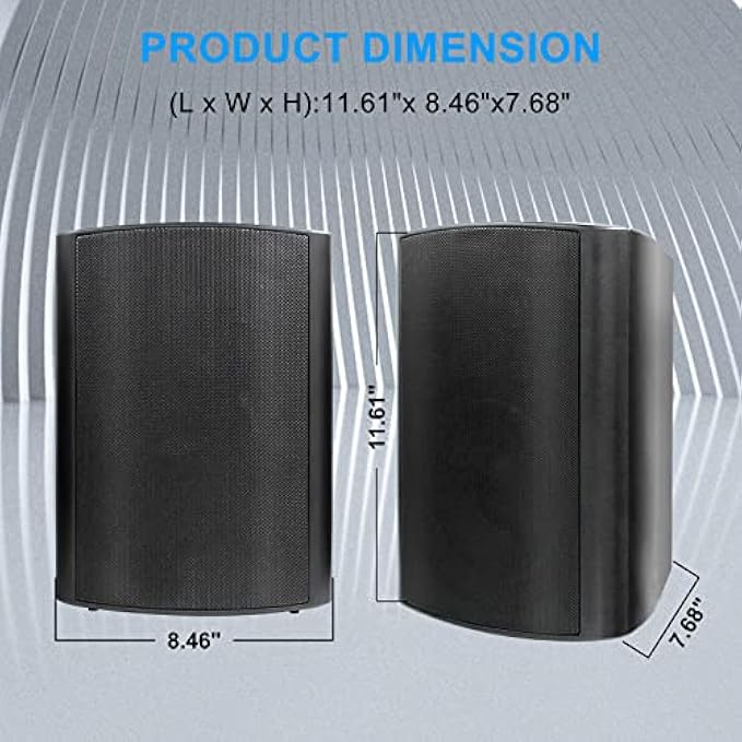 All Weather Outdoor Speakers: IP66 Waterproof Protection,the Passive Outdoor Speakers are water and dust resistant, specially designed to withstand most environments. Hang your speakers outside without fear of damage. Product Dimensions (L x W x H):11.61" (L) x 8.46" (W) x7.68"(H).Installs easily on walls and ceiling.