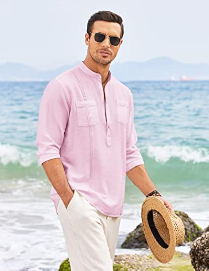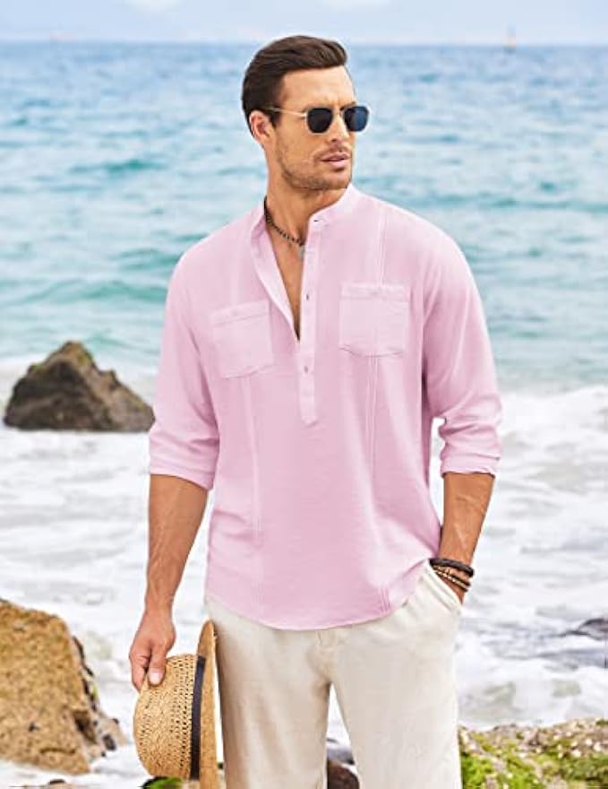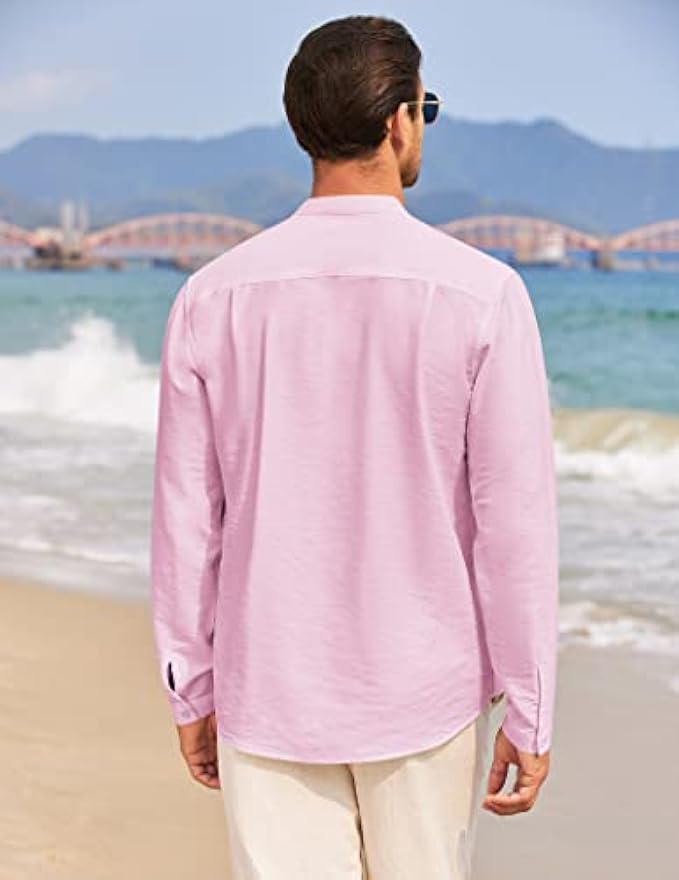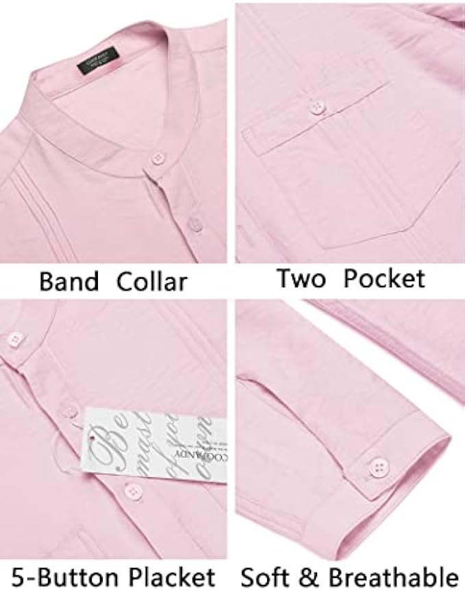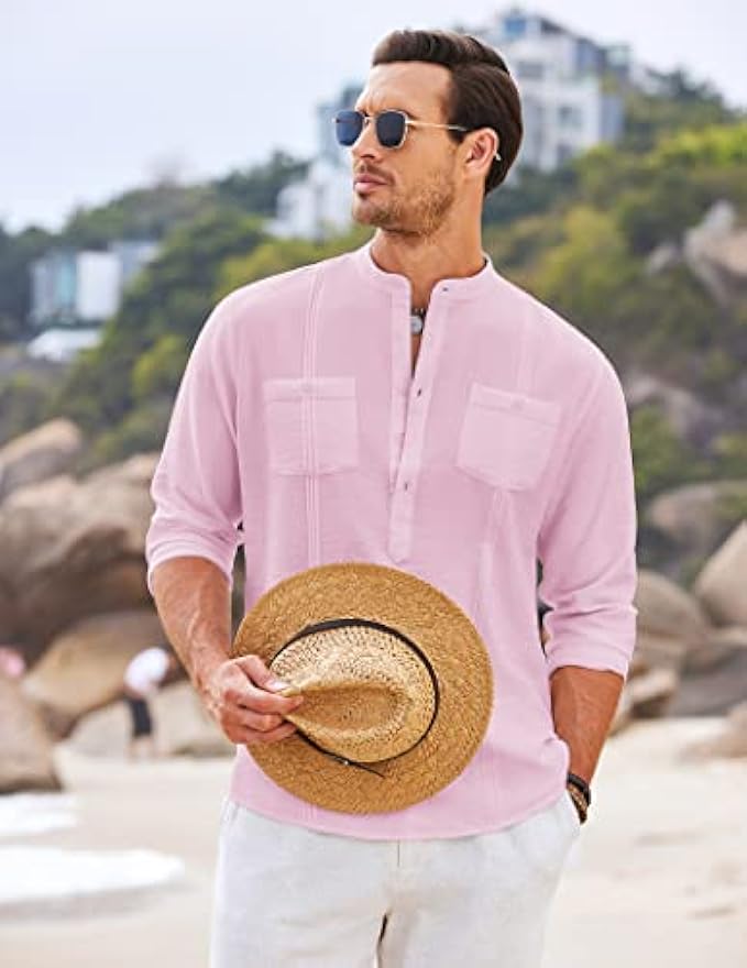 <li class="a-spacing-mini"><span class="a-list-item"> Soft & Breathable Fabric </span></li> <li class="a-spacing-mini"><span class="a-list-item"> Imported </span></li> <li class="a-spacing-mini"><span class="a-list-item"> Button closure </span></li> <li class="a-spacing-mini"><span class="a-list-item"> Machine Wash </span></li> <li class="a-spacing-mini"><span class="a-list-item"> 【MATERIAL】: Made from comfortable and high quality cotton linen fabric, the henley shirt is lightweight, breathable and soft touch, do not shrink and fade, and quick dry. </span></li> <li class="a-spacing-mini"><span class="a-list-item"> 【STYLISH DESIGN】: Men's Guayabera Style Shirt, with band collar, two rows of pleats down each side of the front chest, two pockets, real buttons, solid color, long sleeve(can roll-up), 5-button placket closure and arc hem. </span></li> <li class="a-spacing-mini"><span class="a-list-item"> 【CLOTHING MATCH】: These long-sleeve stylish shirts could be easy to match with dress pants, slacks, chinos, and jeans. Also can be paired with suit jacket, vest, cardigan, slippers, sunglasses and etc. </span></li><li class="a-spacing-mini"><span class="a-list-item">【OCCASION】: This unique casual shirt is great for vocation, beach, wedding, business, work, yoga, party and so on. Perfect for all seasons, especially on spring and summer days. This Guayabera beach shirt is also popular with Latin America for its cool, comfort and elegant design.</span></li> <li class="a-spacing-mini"><span class="a-list-item">【NOTE】: Machine washable, if you wanna loose fit style, please choose a larger size than you normally wear.</span></li>