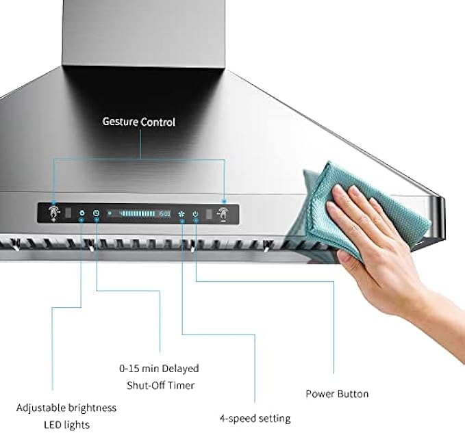 【Quiet Working, Telephone Call While Cooking】With a shock-absorbing and stabilizing ring, 4-speed settings customize your kitchen stove vents to adjust suction and noise levels. The noise level of range hood 36 inch wall mount is set at a minimum of 40dB and a maximum of only 65dB, allowing you to stay away from the noise and immerse yourself in cooking.