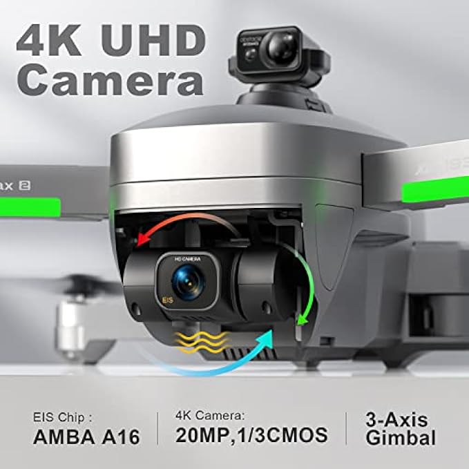 • Seriously Pro Shots & Crisp Camera - 193MAX2 is equipped with advanced camera system, 3-axis gimbal, adopts EIS technology (EIS chip AMBA A16), Capture your World in remarkable detail with 4K/30fps video and 20MP photos.4K photos are stored in mobile phone , 4K video Store in TF card.