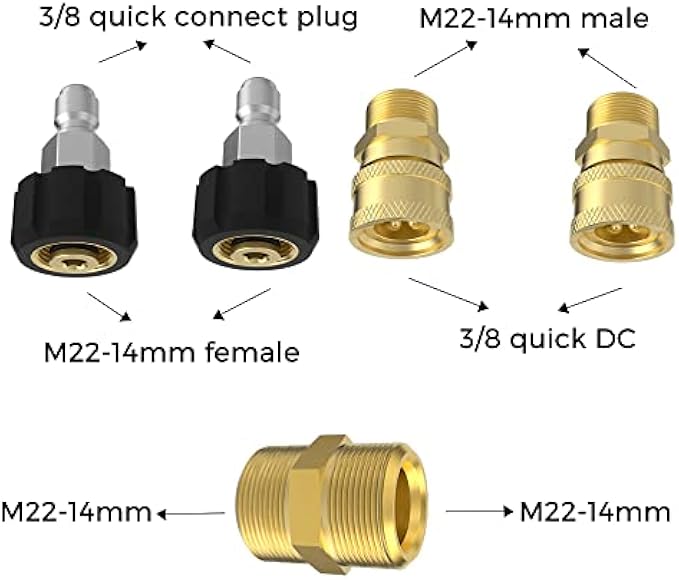 FULLY EQUIPPED — The package contains a 100 ft power washer hose and 5 adapters to deal with most cases. The coupler (M22 14mm Male to M22 14mm Male) is used for connecting two hoses. Other two adapter set (M22 14mm Female to 3/8” Quick Connect Plug and M22 14mm Male to 3/8” Quick Connect Socket) is used for connect QC fittings.