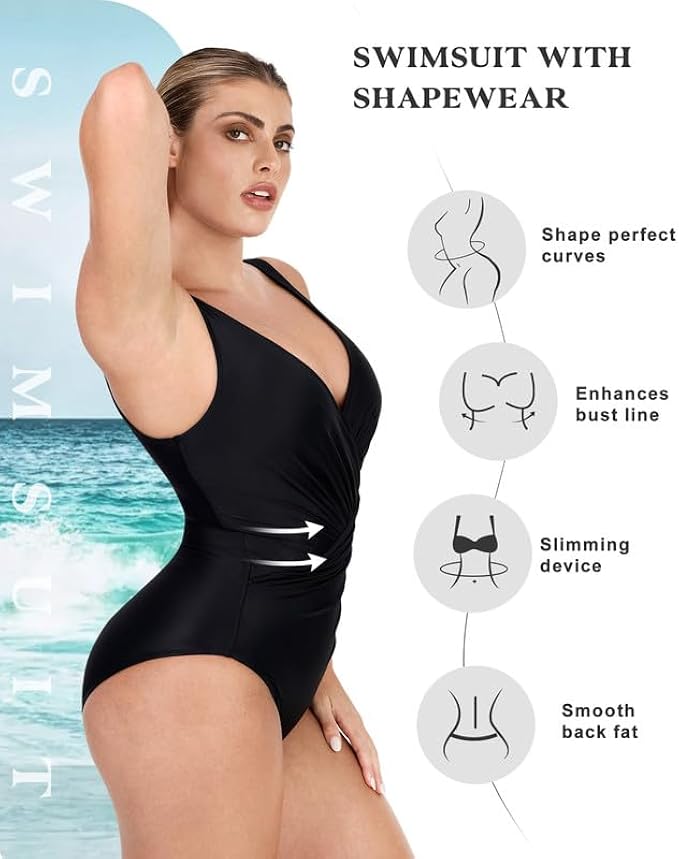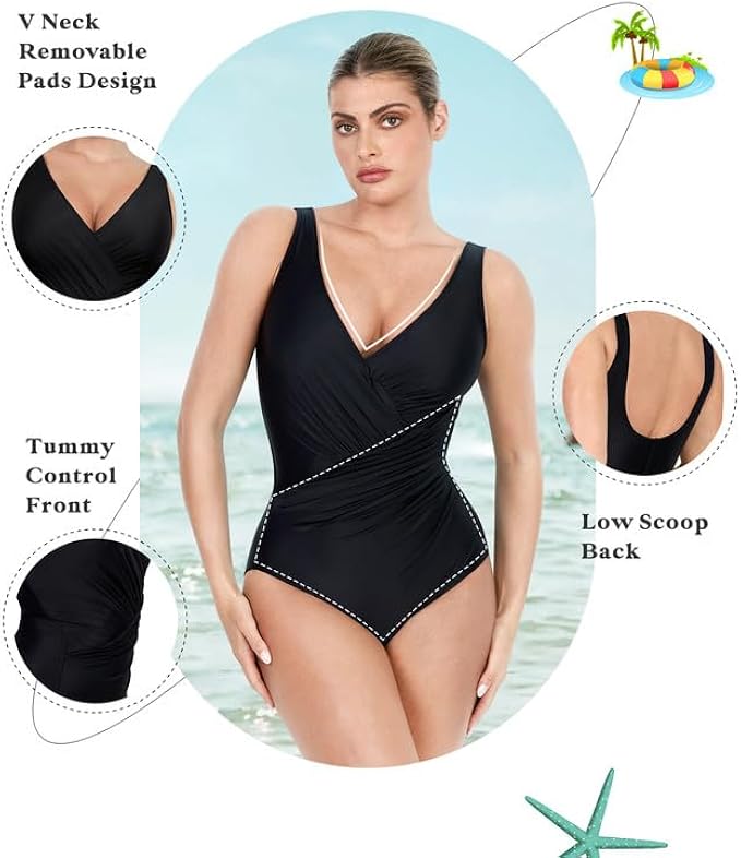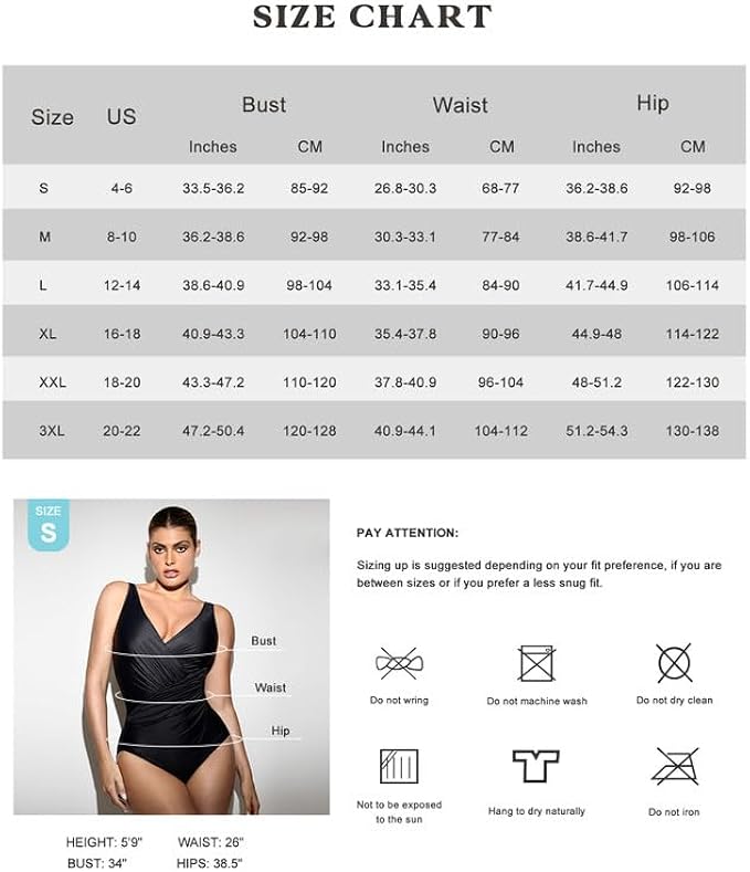 <li class="a-spacing-mini"><span class="a-list-item"> 80% Nylon, 20% Spandex </span></li> <li class="a-spacing-mini"><span class="a-list-item"> Pull On closure </span></li> <li class="a-spacing-mini"><span class="a-list-item"> Do Not Tumble Dry </span></li> <li class="a-spacing-mini"><span class="a-list-item"> FIT &amp; SIZE: When purchasing a tummy control swimsuit for the first time, many customers order a swimsuit in their usual size for the most comfortable and slimming fit. Sizing up is suggested depending on your fit preference, if you are between sizes or if you prefer a less snug fit. </span></li> <li class="a-spacing-mini"><span class="a-list-item"> PLEATED WAIST AND ABDOMEN DESIGN: The One Piece Swimsuits Visually can cover the meat to show thin. A stunning solid makes your hips and waist essentially disappear with the help of a shirred wrapped waistline contoured to fit each curve. A plunging v-neckline and low scoop back allow room for spunk while remaining subtle in the most-flattering, characteristic style this side of the sun. </span></li> <li class="a-spacing-mini"><span class="a-list-item"> REMOVABLE COASTER &amp; TUMMY CONTRAL - The beauty of these swimwear is that the power mesh with the perfect amount of compression does a superb job of covering your tummy to create a streamlined silhouette. removable padding that gives you maximum freedom. Say goodbye to muffin top and to be a better you. It also stays in place pretty well from start to finish without squeezing or digging in. so you could be fully focused on your trip. </span></li> <li class="a-spacing-mini"><span class="a-list-item"> FABRIC &amp; CARE: After each use, hand wash your in cool, clear water and hang to dry. Do not use chlorine bleach. Do not iron or tumble dry. Following these instructions will help extend the lifespan of your swimsuit so you can enjoy it even longer. </span></li> <li class="a-spacing-mini"><span class="a-list-item"> OCCASION: The vintage sexy one piece swimsuit is very suitable for a wife or girlfriend to travel, honeymoon or birthday gift. This push up padded swimsuit is a good choice for Tropical Vacations, Summer, Beach &amp; Pool, Honeymoon, Cruise, swimming, sunbathing, hot tub and beach walking! </span></li>