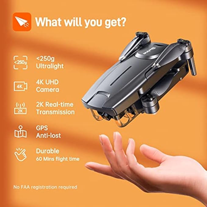 【4K UHD CAMERA】: The optimized full HD camera built with a shock absorption ball imported from Germany ensure that camera can catch much more UHD 4K(4096x3072P) high-resolution details. Videos can be recorded with 2.7k stored on an SD card and 2K in phone watching. 5GHz FPV transmission plus 90° adjustable camera with a 130°FOV lens enables to capture epic wide-angle shots from 1,640 feet in a bird's-eye view. 【GPS SMART FLY】: ①It returns automatically whenever the battery is low, the signal is lost or you press one key to return. No more worrying about losing your drone. ②More intelligent functions just for you, like following you automatically, flying along a path you set and flying around a point in circles. ③Moreover, it is equipped Multi Sensors, air optical flow and air pressure altitude control system, the drone can hover stably both indoors and outdoor, very friendly to young beginners. 【DOUBLE BATTERY, DOUBLE FUN】: Comes with 2 batteries and up to 60 minutes of flight time let your drone swim in the sky freely. Even if you're flying the drone for the first time, the training time is long enough to train you from beginner to proficient. Less charging, more flying. 9 kinds of over-current protection when charging and very safe to store when not in use. 【UNIQUE DESIGN】 ①Weight under 250g to save you from FAA registration, take it like a hamburger in your hand with an advanced foldable design, which makes it very easy and convenient to fly everywhere anytime without restrictions. ②Besides, F7mini brushless motors run more powerful with much less noise compared to brushed motors, in addition, it adds a layer of protection net, which is better free from the interference of foreign objects when flying, so that your motor has a longer life 【WHAT WILL YOU GET?】: 1 x Bwine F7mini Drone, 1 x Transmitter 2 x 7.6V 2100mAh Batteries, 8 x Propeller Blades, 3 x Manual guide, 1 x Portable bag, 2 x USB Cable, 1 x Screwdriver, 10 x Screw. Besides, we offer a 2-year warranty for replacing your damaged item and 30-day money back for any reason. Any questions, we are always here for you.