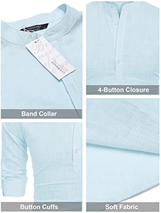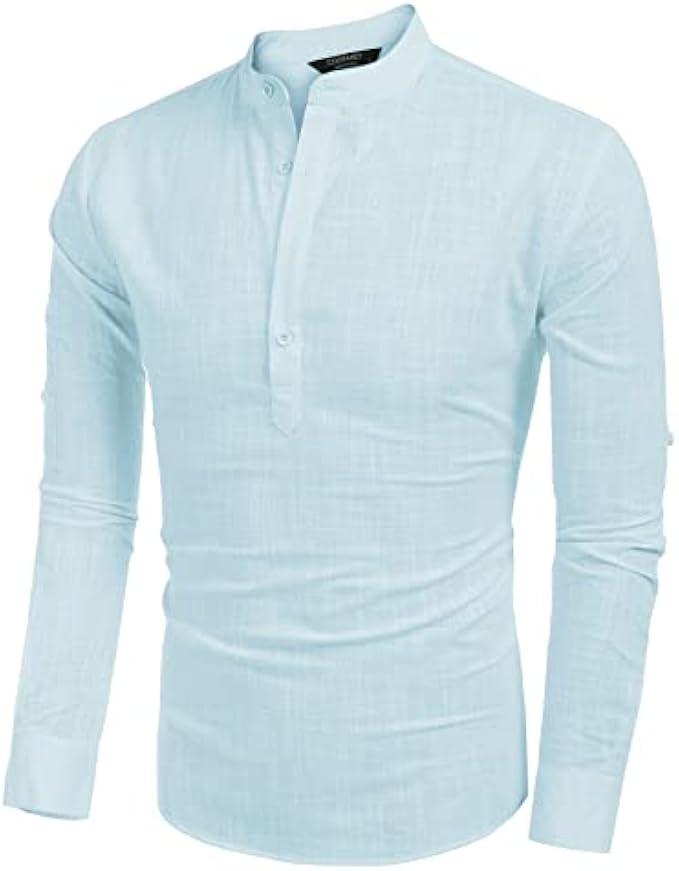 <li class="a-spacing-mini"><span class="a-list-item"> Cotton and Linen </span></li> <li class="a-spacing-mini"><span class="a-list-item"> Imported </span></li> <li class="a-spacing-mini"><span class="a-list-item"> Button closure </span></li> <li class="a-spacing-mini"><span class="a-list-item"> Machine Wash </span></li> <li class="a-spacing-mini"><span class="a-list-item"> 【HIGH QUALITY FABRIC】: This linen shirts made from great fabric, lightweight, breathable and soft touch, do not shrink and fade, moisture-wicking. </span></li> <li class="a-spacing-mini"><span class="a-list-item"> 【STYLISH DESIGN】: Casual henley neck shirts, stand collar, simple style, solid color, slim fit, long sleeve(Roll-up), button-down closure, rounded hem, featured button detail. </span></li> <li class="a-spacing-mini"><span class="a-list-item"> 【CLOTHING MATCH】: These long-sleeve stylish slim fit shirts could be easy to match with dress pants, slacks, chinos, and jeans. </span></li><li class="a-spacing-mini"><span class="a-list-item">【OCCASION】: Perfect for spring, autumn and summer, fashion style, formal work, business wear, everyday casual wear, beach wear and etc.</span></li> <li class="a-spacing-mini"><span class="a-list-item">【SUGGESTION】: Machine washable. Please refer to our size chart picture before ordering, thanks in advance.</span></li>