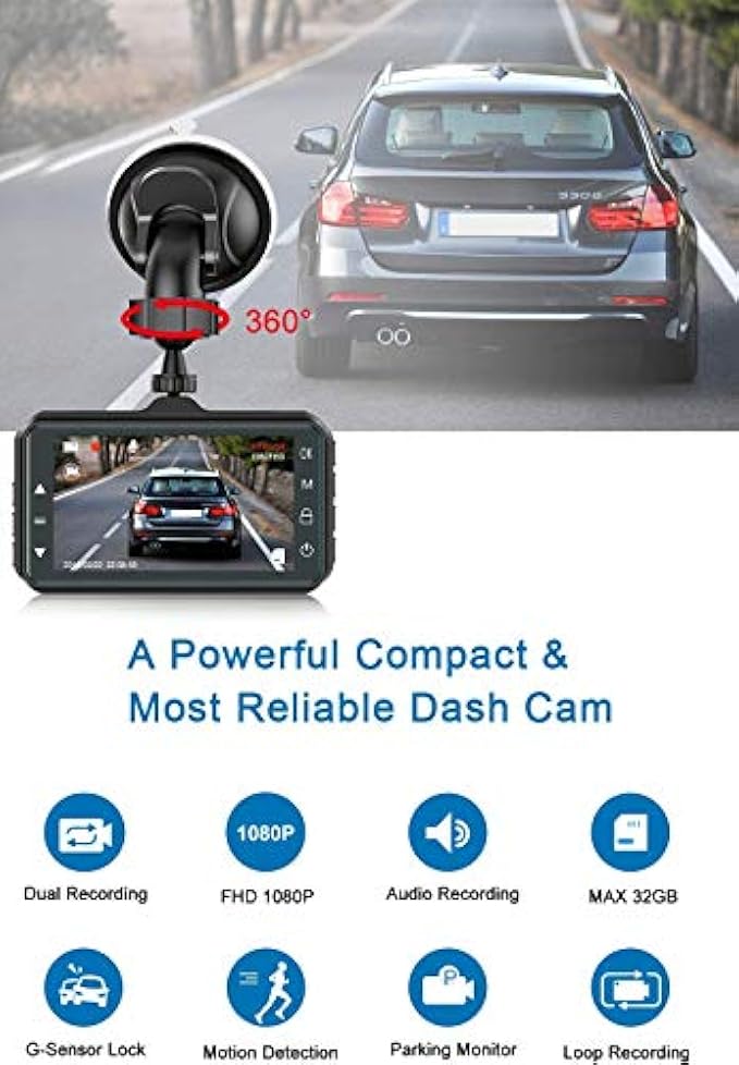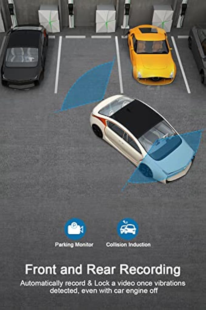 • ★ 【Dash Cams with Parking Mode】The dash cams automatically powers on and starts recording as soon as impact is detected, thus providing you a video evidence if your car is scratched by someone in parking. Hence ensuring your peace of mind with complete 24x7 monitoring of your car.We suggest some important function settings for your daily using: G-Sensor level choose" low" , or turn off; loop recording choose “3 minutes”; motion detection choose "off" ; parking monitor choose "On".