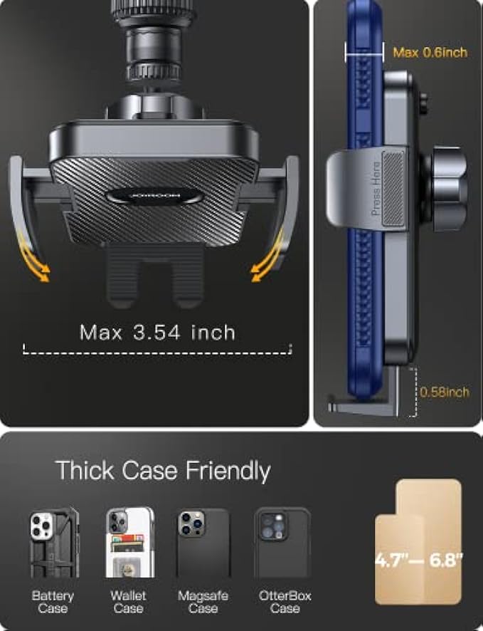 • ?[ Broad Compatibility] JOYROOM phone mount for car is compatible with all cell phones from 4" to 6.8" with a thick case; The steel hooks up to 1.57'', 50% longer than ordinary type, no trouble of too short to lock on the vent blades. NOTE: Compatible with Horizontal & Vertical Air Vents, not concave-convex vents.