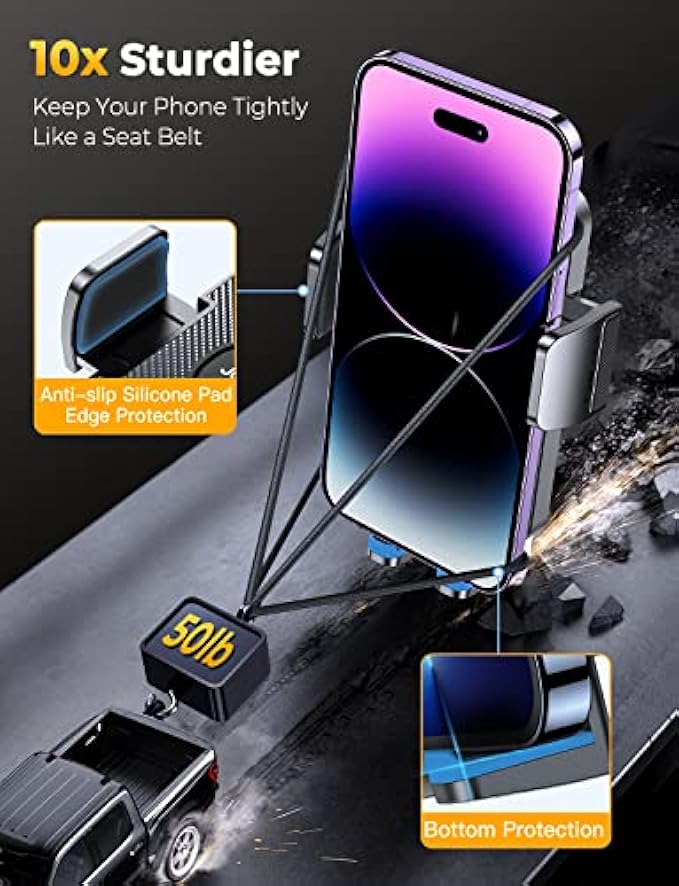 • ?[ 3S: Sturdy, Stable, Secure ] 2022 Latest Version Car Vent Phone Mount, Military-grade impact-resistant toughened material, widened drop-down bottom shelf, softer silicone pads and super stable three-point support structure resist any shaking. ensures absolutely safe driving, and stability for long trips.