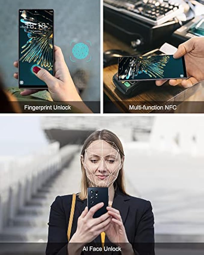 • 【Face ID + Fingerprint Mobile Phone】 6.8 inch large screen 5G LTE phone unlocked with face recognition function + Fingerprint, 5 points touch capacitive touch screen. Magnesium aluminum body, Nano 3D galvanizing gradient glass back cover. Support WIFI + BT + FM + GPS function, USB C interface, standard 3.5mm headphone jack.