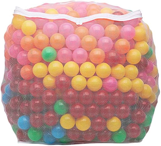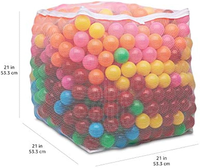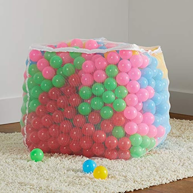 Includes 1,000 balls in an assortment of 6 bright colors, plus a mesh storage bag with a zipper closure