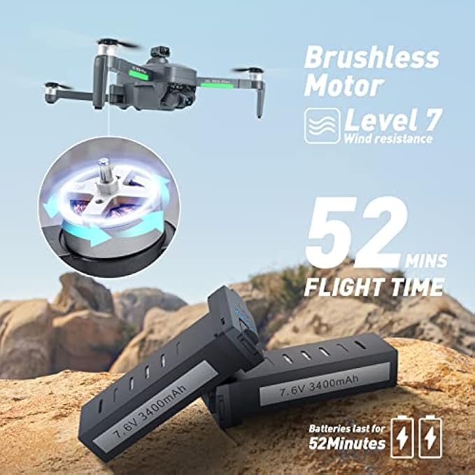 • 52 Min Long Flight Time & Level 7 Wind Resistance: Come with 2 intelligent batteries support up to 52 minutes flight,the foldable design and well-fitted carrying case make it easy to take the drone outdoor;The High-Performance Brushless Motors have lower power consumption and give you a quieter flight(fly speed can up to 42km/h) and provide you a stable and powerful fly experience.