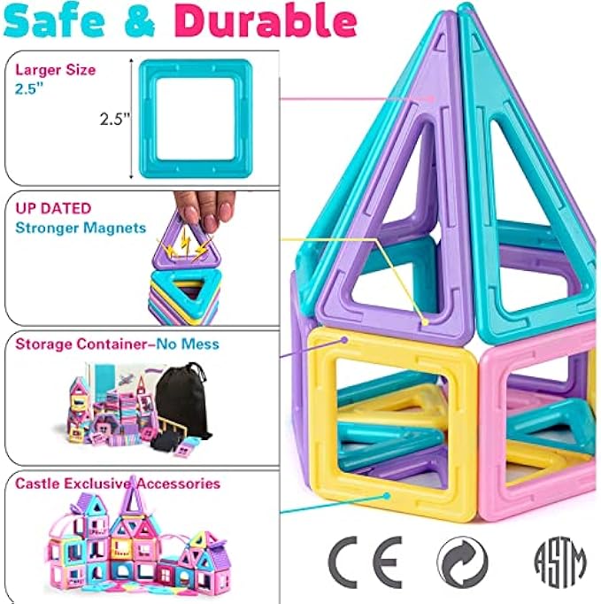 • 【High Quality Magnet and Safe】-The magnetic tiles made of safe and durable ABS plastic. Round edge design without sharpness, no worry about hurting your kid's little hands. The magnets building blocks are strong enough to withstand tall castle. The different shapes allow maximum creativity, appealling toys age 3 4 5 6 7 year old girls boys.