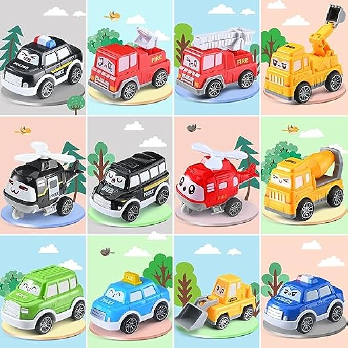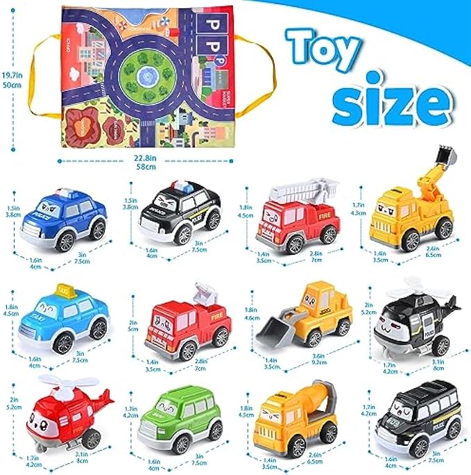 Toddler Toys Car Set - We have 12 different car shapes,cute expressions, include a taxi, ambulance, fire engine, police car cartoon drawings better arouse kid's curiosity and give children a happy world. Great toddler toys for 1 2 3 4 year old boys girls.