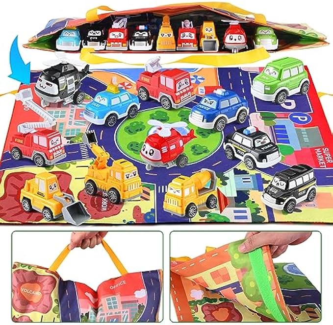2 in 1 Play Mat/Storage Bag - The push and pull cars for toddlers includes city street map,Kids can sit on a simulated urban traffic scene, let their imaginations run. It also folds up into a storage pouch, making it easy to fit any toy car into. which can cultivate a kid's storage ability and easy-to-carry.
