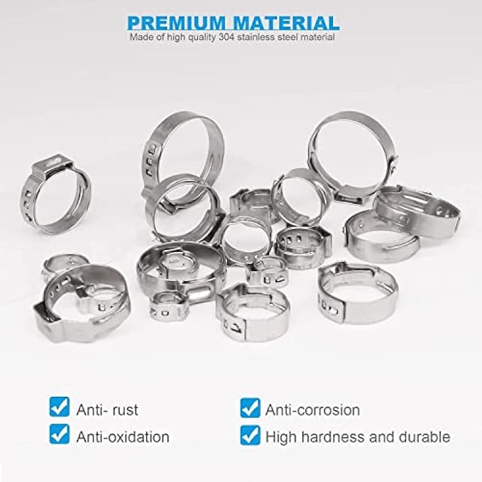 • [Premium Quality] High precision single ear stepless hose clamps are Made of 304 Stainless Steel, has good corrosion resistance, heat resistance, low temperature strength and mechanical properties, a good choice for long-term use.hose clamps are used to seal various types of hoses.