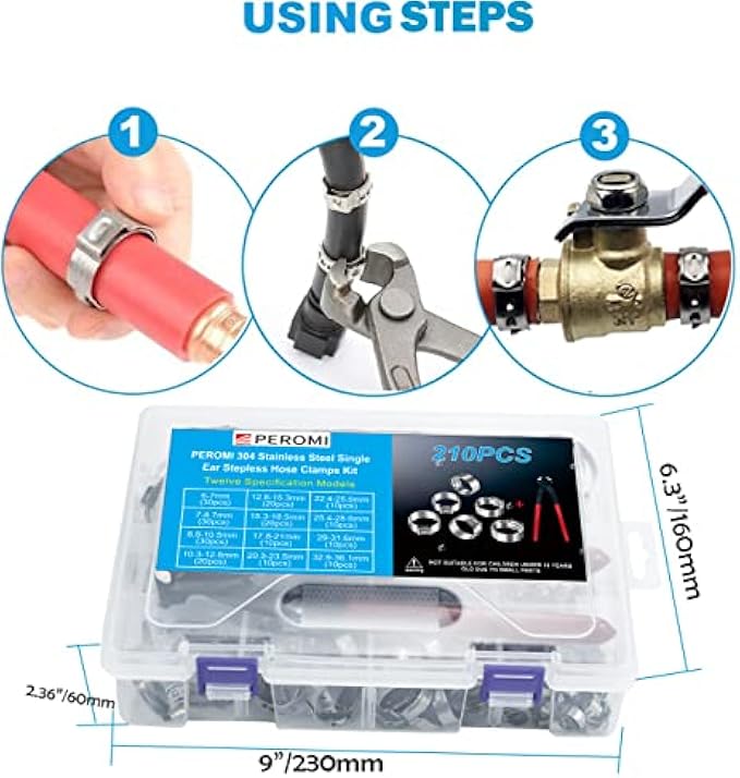 PEROMI 210pcs Single Ear Hose Clamp with Pincers Crimper Tool,12 Size 6-36.1mm 304 Stianless Steel Cinch Clamp Rings Assortment Kit for PEX Tube Fitting connections