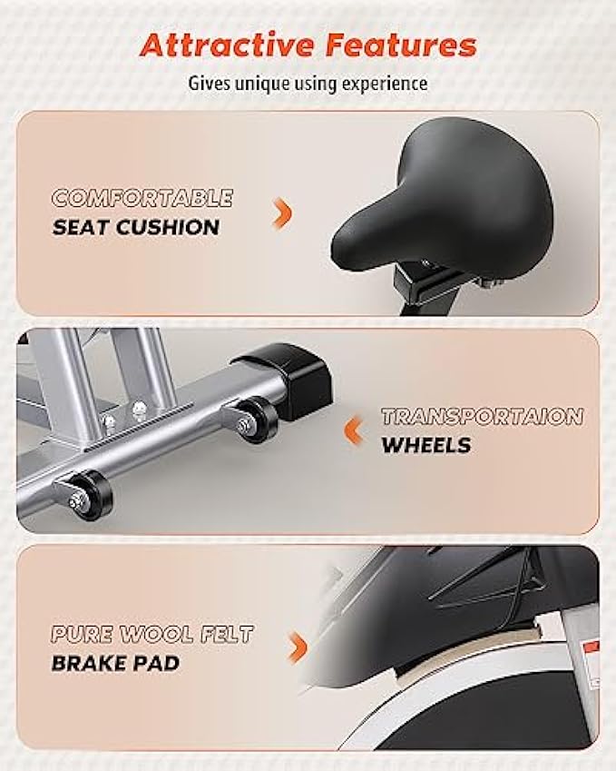 【Smooth Stationery Bike】30lbs flywheel and heavy-duty steel frame of the exercise bike guarantee stability while cycling. The belt-driven system provides a smoother and quieter ride than chain transport. It won't disturb your sleeping kids or apartment neighbors.