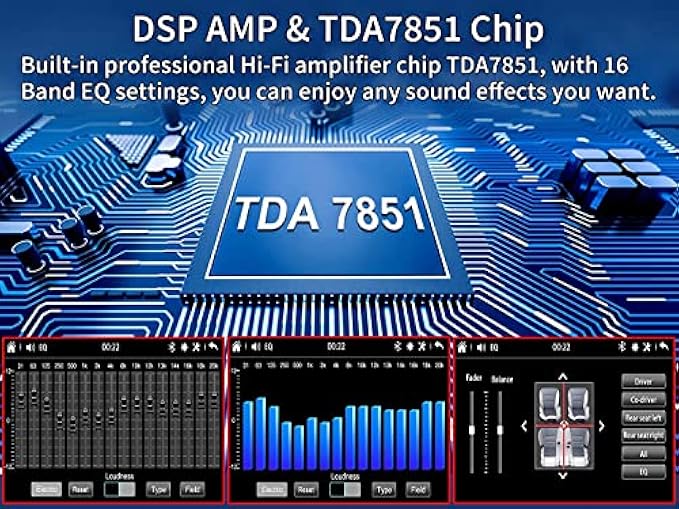 • ?【Ultra-high sound quality - DSP】The Apple Carplay built-in professional Hi-Fi amplifier chip TDA7851, with 16 band EQ settings, can meet your needs for different sound quality, so as to enjoy excellent sound quality on the go.