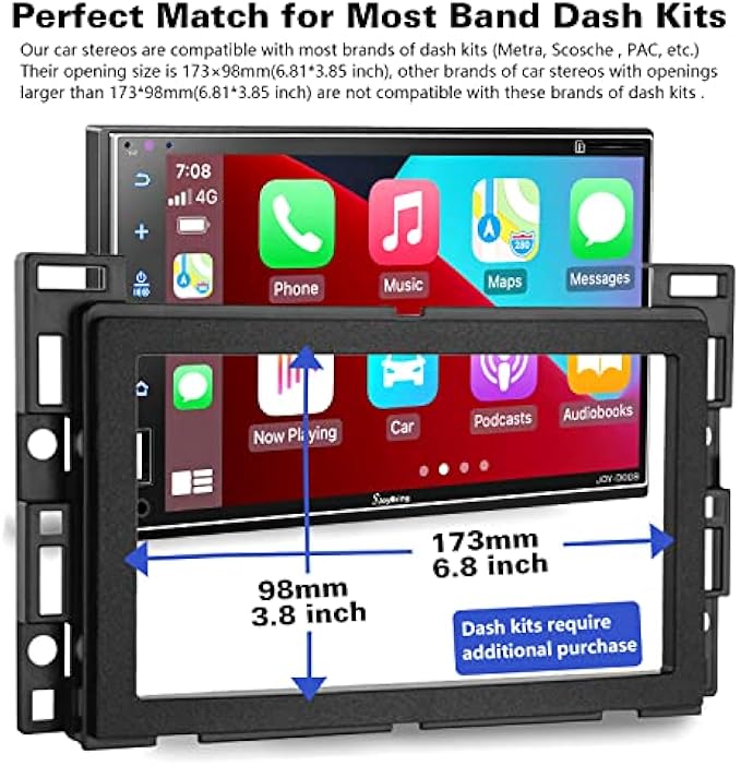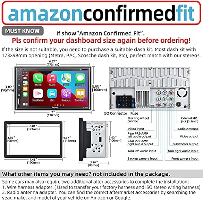 • If you find that our stereo size does not match your dash size, please purchase a suitable dash kit, most brand dash kits use 173×98mm(6.81×3.85inch) opening, (Metra, PAC, Scosche dash kits, etc.) or modify your dashboard when you install the stereos. You may need to buy some items which not included in the package: Kits for your vehicle, a wiring adapter, an antenna.
