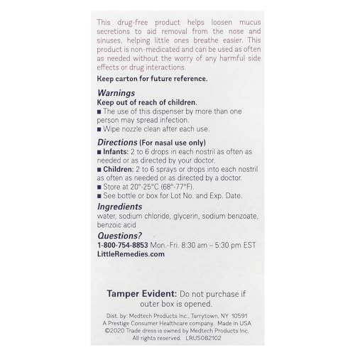 About this item Unique design can be held downward as a saline dropper or upright as a saline spray Relieves runny, stuffy, dry, or crusty noses Flushes and removes mucus from little noses to help little ones breathe easy; non-medicated relief that safely soothes and moisturizes Safe for newborns; drug-free, no side effects; use as often as necessary to keep baby's nose clear and moisturized 0.5 fluid ounce. Suggested Age: Newborn and Up