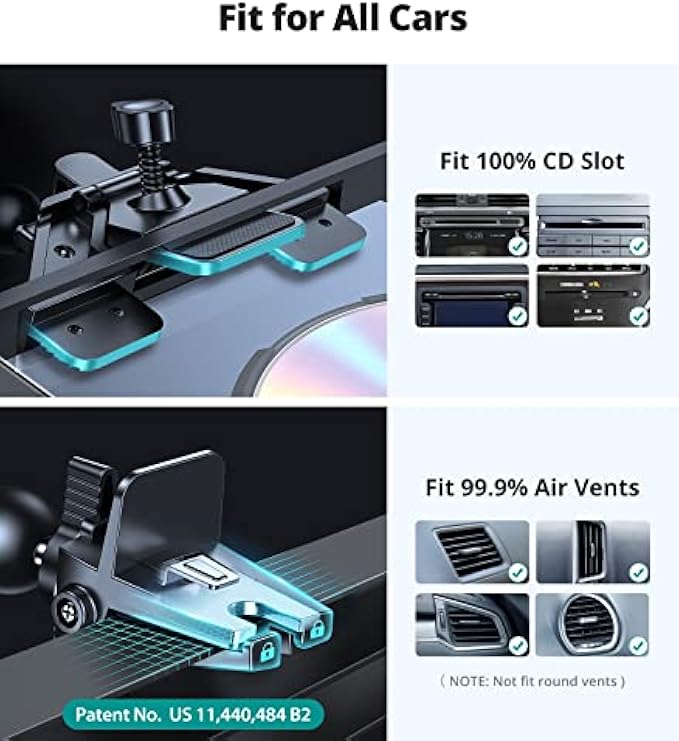 • 【2 in 1 Sturdy Phone Mount for Car】Simple but Unique! Two mounting methods applied in ONE phone holder for car, which means you can mount it on cd slot or air vent. Will not block your view