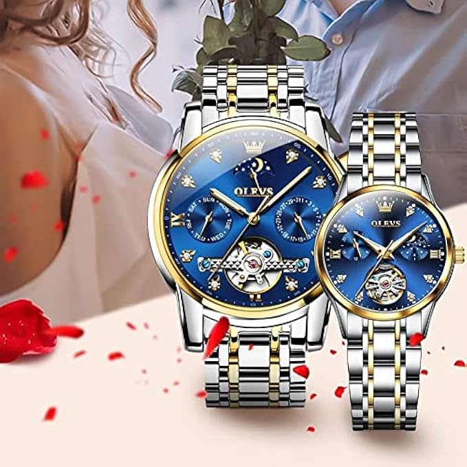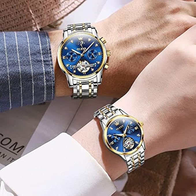 OLEVS Valentines Couple Pair Automatic Watches His and Her Couple Set Diamond Wrist Watch Men and Women Lovers Wedding Romantic Gifts Set of 2