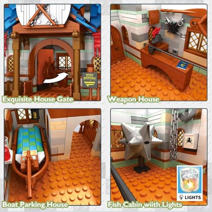 • 【Beautiful Lighting Design】The medieval fishing gear store toys contains lighting design, it has a second floor roof with light. The entire building follows a layered quick-disassembly structure for easy assembly and disassembly. It has a quick-disassembly roof design and the fishing platform items can be disassembled. This house model has many details, manually operated doors and windows add to its authenticity, and you will find a fish cabin, weapons room and bedroom, each carefully designed.