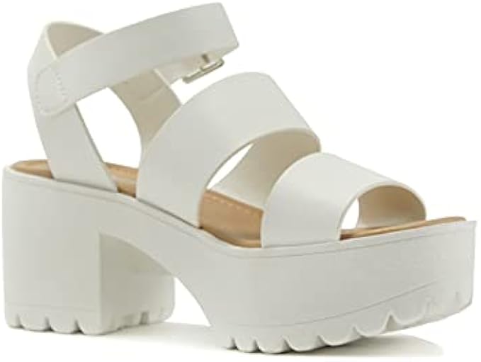 Soda ACCOUNT ~ Women Open Toe Two Bands Lug sole Fashion Block Heel Sandals with Adjustable Ankle Strap