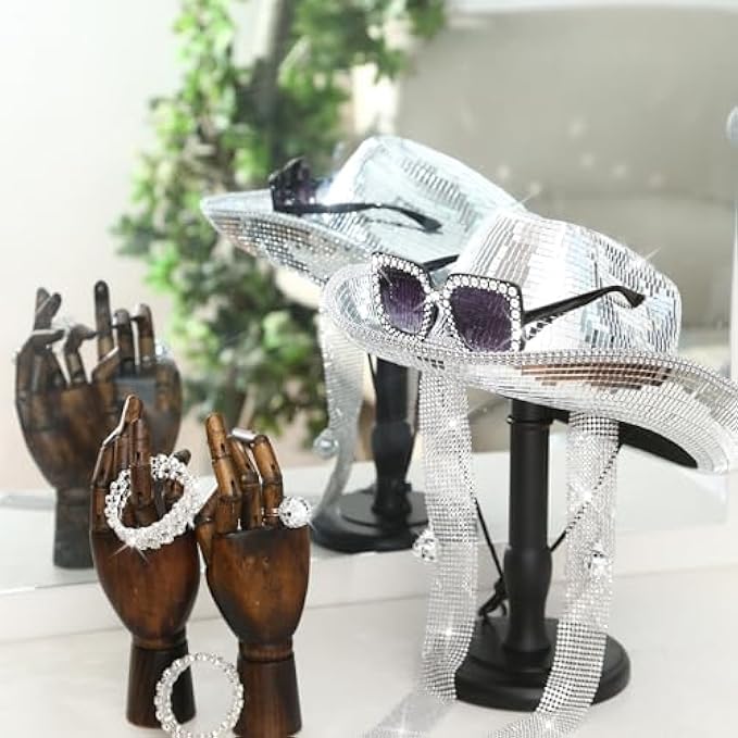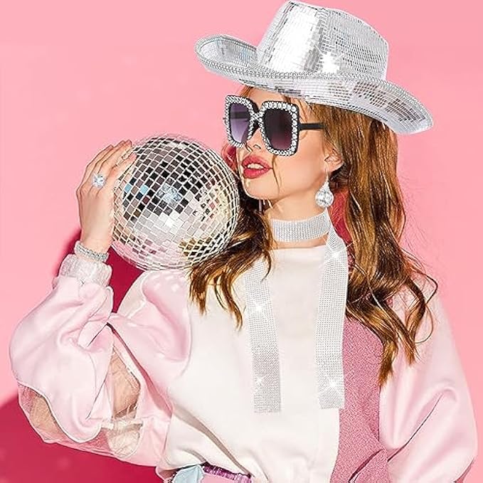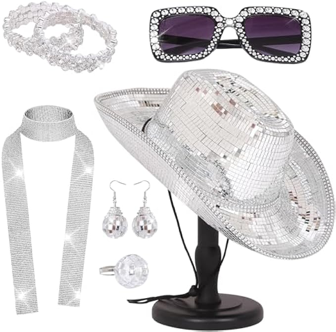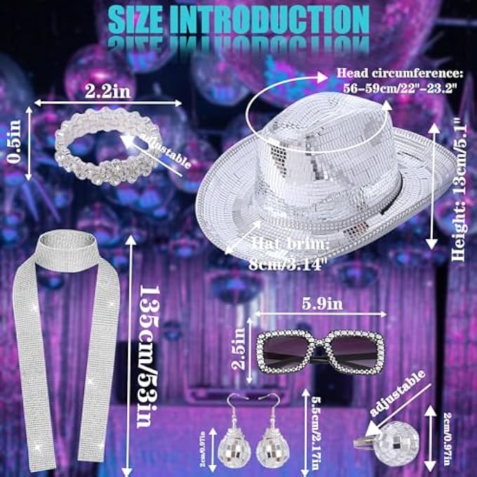• What will you get? You will receive 1 disco ball cowboy hat, 1 silver rhinestone scarf, 1 pair of disco glasses, 1 pair of disco ball earrings, 1 disco ball ring, and 2 disco ball bracelets to prepare for your disco party