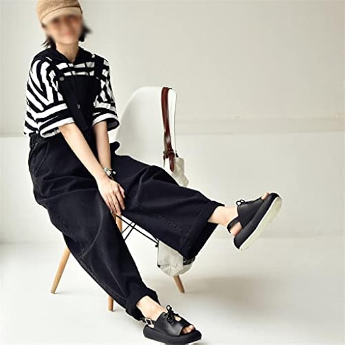 DSFEOIGY Literature and Art Leisure Fashion Loose Comfortable Broad Leg Along Jeans Straps Trousers (Color : Blac, Size : L Code)
