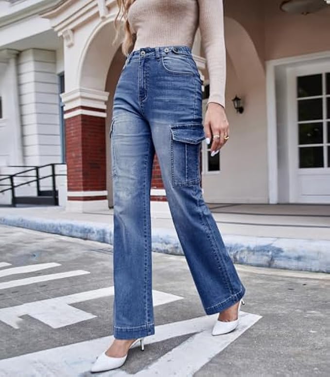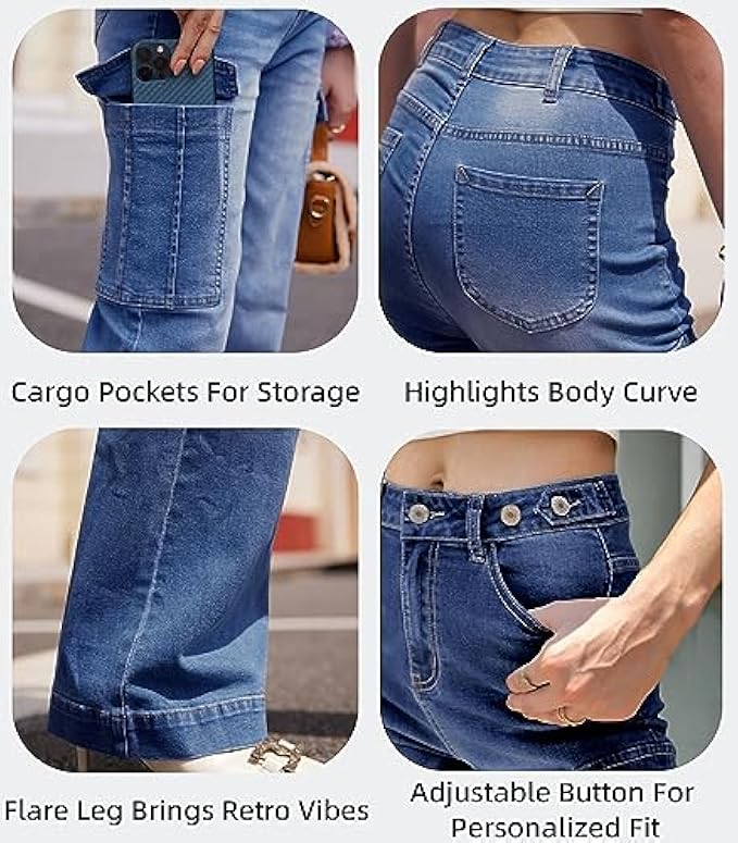 <li class="a-spacing-mini"><span class="a-list-item"> Cotton 60%,Viscose 35%,Arlon 5% </span></li> <li class="a-spacing-mini"><span class="a-list-item"> Imported </span></li> <li class="a-spacing-mini"><span class="a-list-item"> Zipper closure </span></li> <li class="a-spacing-mini"><span class="a-list-item"> Machine Wash </span></li> <li class="a-spacing-mini"><span class="a-list-item"> Material:The high rise jeans is designed to fit comfortably with a stretch fabrication.Perfectly fits to your body but not too tight.Stretch fabric offers ease of movement and durable wearability. </span></li> <li class="a-spacing-mini"><span class="a-list-item"> Design:Front button and zipper closure.Multiple pockets for easy storage.Featuring two side flap cargo pockets ,two front pockets and two back pockets for storing small items.These bootcut jeans feature a retro-inspired flared leg, subtle fading and whiskering. Adjustable button for a personalized fit. </span></li> <li class="a-spacing-mini"><span class="a-list-item"> Style:Bell bottom cargo jeans for women/High waisted mom jeans/Jeans for women high waist stretchy/Boyfriend baggy jeans for women/Wide leg trouser pants for women/Adjustable waist cargo pants women/Business casual pants for women </span></li><li class="a-spacing-mini"><span class="a-list-item">Match:Cargo pants for function and style in-one.The denim pants can style with a crop top and heels for a super stylish look. Suits for casual activities,work,business,office,streetwear.</span></li> <li class="a-spacing-mini"><span class="a-list-item">Care&Size:Turn inside out and machine wash on cold.Wash with like colors.The size runs true, take your normal size for a more fitted look or size up for an oversized look.</span></li>
