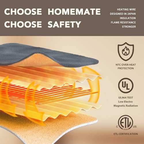 【SAFETY】: Homemate Heated blankets have passed the American safety UL964 Test.Have ETL Certification.Lower Electro Magnetic Radiation.The heating wire is designed and produced by Japanese company,more advanced technology,stronger insulation and flame resistance.Moreover,the heated blanket use NTC overheating protection technology to ensure that it will not overheat and cause burning.