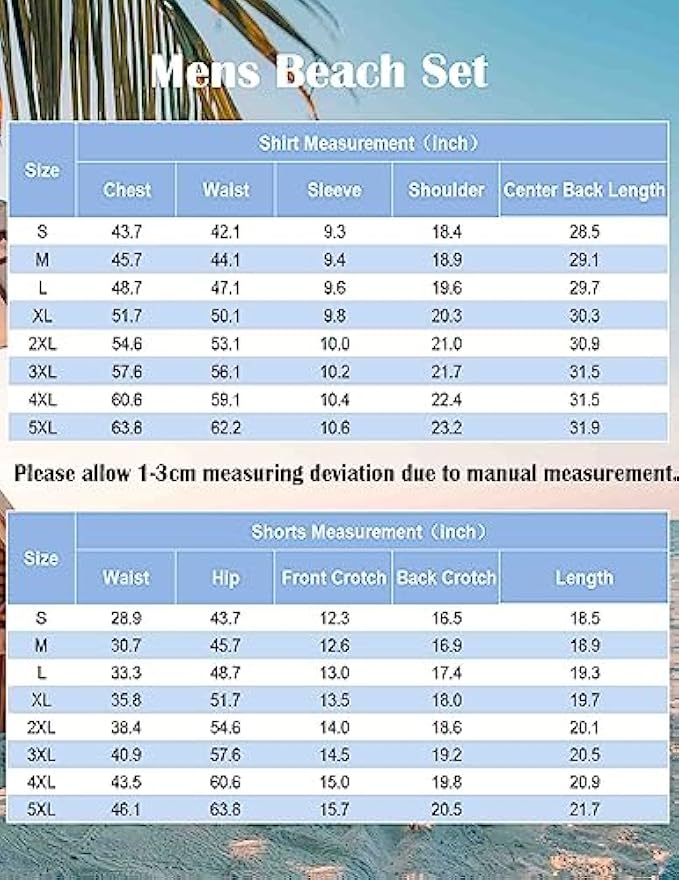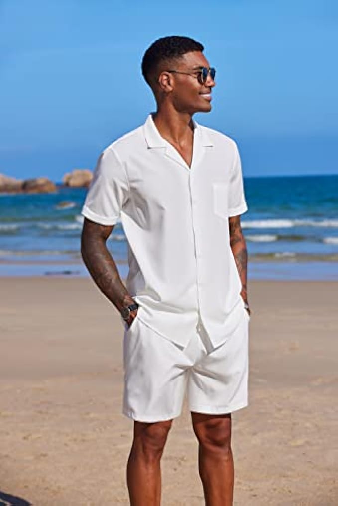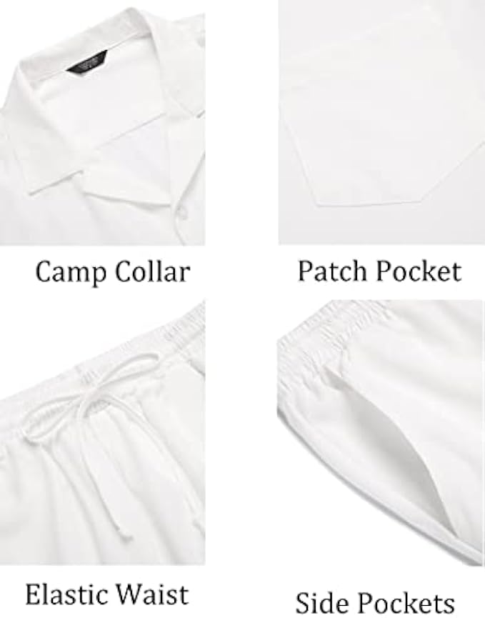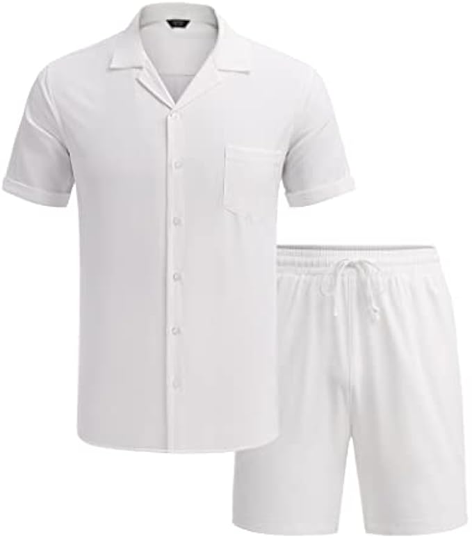 <li class="a-spacing-mini"><span class="a-list-item"> Lightweight Soft Fabric </span></li> <li class="a-spacing-mini"><span class="a-list-item"> Imported </span></li> <li class="a-spacing-mini"><span class="a-list-item"> Drawstring closure </span></li> <li class="a-spacing-mini"><span class="a-list-item"> Machine Wash </span></li> <li class="a-spacing-mini"><span class="a-list-item"> 【HIGH QUALITY FABRIC】: This mens short sleeve beach shirt set made from lightweight soft fabric, breathable, skin friendly, give you the most comfortable wearing experience in all seasons. Do not shrink and fade, Moisture-wicking. </span></li> <li class="a-spacing-mini"><span class="a-list-item"> 【CASUAL DESIGN】: The mens summer shirt and shorts set, button-down short sleeve, camp collar, featured button cuff and patch pocket. Casual Shorts with side pockets and rear pockets, elastic waist drawstring. Simple style, solid color, classic holiday style wear. </span></li> <li class="a-spacing-mini"><span class="a-list-item"> 【EASY TO MATCH】: For a foolproof leisure option, you can always rely on this hippie shirt outfits. The beach shirt can be paired with Hawaiian print shorts, dress pants, slacks, chinos and jeans. Add a pair of loafers, canvas shoes and sandals to create stylish styles. </span></li><li class="a-spacing-mini"><span class="a-list-item">【OCCASION】: The men's casual shirts set perfect for outings, holiday, camps, vacation, travel, beach, cruise, tropical Hawaiian, birthday, party, dating, hippie, fashion streetwear and casual daily wear.</span></li> <li class="a-spacing-mini"><span class="a-list-item">【NOTICE】: Machine washable. US size. If you wanna loose fit hawaiian shirt set, please choose a larger size than you normally wear.</span></li>