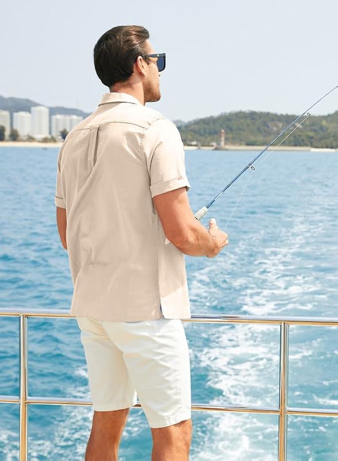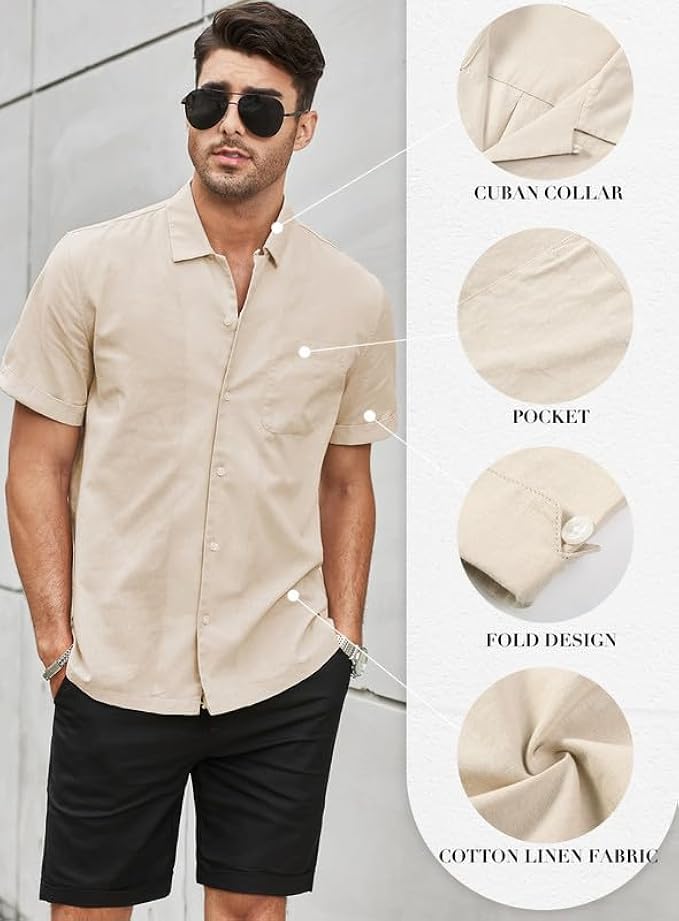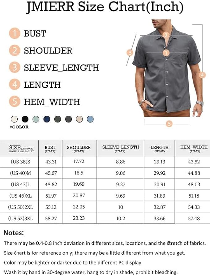 <li class="a-spacing-mini"><span class="a-list-item"> cotton linen </span></li> <li class="a-spacing-mini"><span class="a-list-item"> S=(US 38), M=(US 40), L=(US 43), XL=(US 46), 2XL=(US 48), 3XL=(US 52). </span></li> <li class="a-spacing-mini"><span class="a-list-item"> Button closure </span></li> <li class="a-spacing-mini"><span class="a-list-item"> Machine wash or hand wash, no shrinkage after washing. </span></li> <li class="a-spacing-mini"><span class="a-list-item"> High Quality Material:This mens casual button up hawaiian shirt was made of high quality material, Cotton and linen fabric is very soft, breathable and not easy to wrinkle. Very suitable for summer wear, It is light and feels soft. </span></li> <li class="a-spacing-mini"><span class="a-list-item"> Cuban collar&amp;Hawaiian Style: It's Cuban cut features a classic fold to the sleeve ends, stitched to maintain look, along with the hidden top button.There is also a pocket on the right side of the shirt for a casual look,It is also very convenient for keeping small items with you. </span></li> <li class="a-spacing-mini"><span class="a-list-item"> Match: Men's cotton linen button up hawaiian shirt is suitable as a casual shirt, Hawaiian shirt, work shirt,dress shirt. It can be paired with denim shorts or and slacks, perfect for beach vacations. </span></li><li class="a-spacing-mini"><span class="a-list-item">Occasion: Perfect for spring, autumn and summer. This tropical style button down guayabera shirt is great for many occasions,it's can be a gift for your husband. Not only can be worn on summer holidays, theme parties, sunny beach, wedding, fishing and etc, but also can be worn for work or daily life.</span></li> <li class="a-spacing-mini"><span class="a-list-item">Size and Service: Please Refer to the JMIERR Size Chart before Ordering,Not Amazon Size Chart.</span></li>