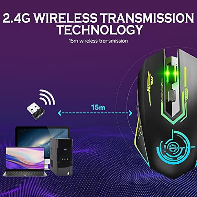 • 【Get Away from the Cable】The gaming mouse adopts 2.4GHz transmission technology, providing reliable, precise and long rang connection, up to 50ft. The response is near-instantaneous. Response rate represents the data transmission speed between the mouse and computer, a higher rate of response in games competitions can better play the performance of the mouse and allows the mouse to be zero delays and no jump during fierce gaming, which is more realistic for Gaming Players.