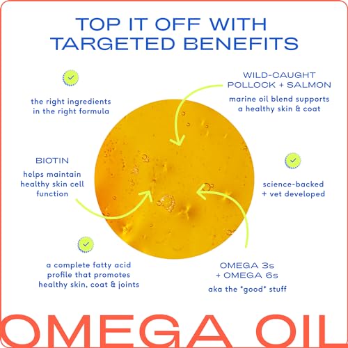 TARGETED SKIN SUPPORT WITH BIOTIN + WHEAT GERM: Biotin helps improve dry, flaky skin while wheat germ oil delivers vitamin E for coat shine. Together, they boost our omega for dogs into a liquid fish oil powerhouse.